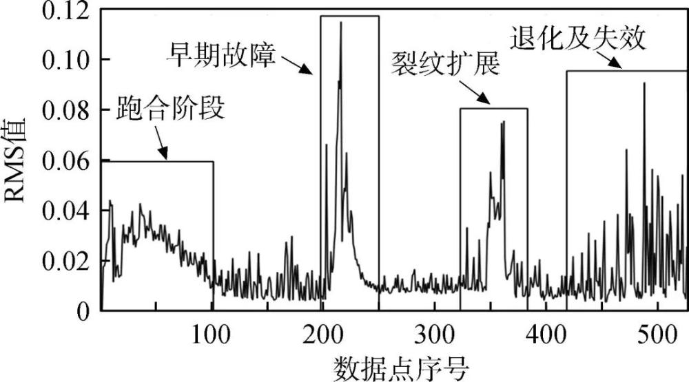圖3 軸承全壽命試驗聲發(fā)射信號RMS值變化[48]